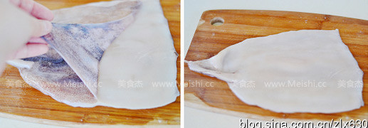 7.但這次記住,第四刀的時候要將魷魚切斷,以此類推,直至整片魷魚切完,然后再切另一半