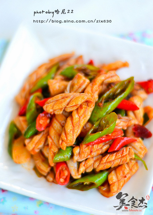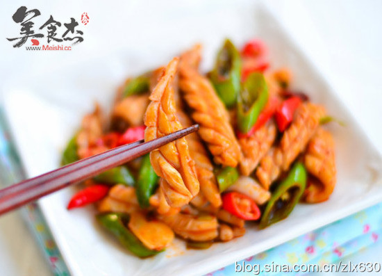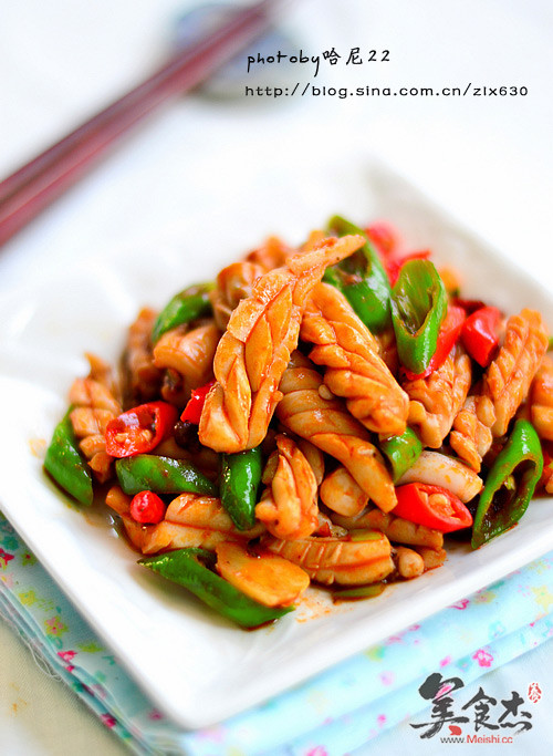 12.加入鹽、雞精、白胡椒和料酒調味,再放青紅尖椒,炒勻即可出鍋