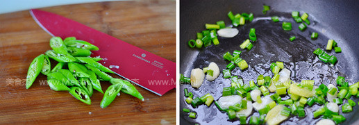 10.鍋中倒油燒熱,放入蔥花和蒜片