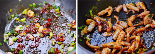 11.倒入郫縣豆瓣醬,放入魷魚翻炒