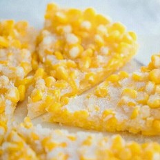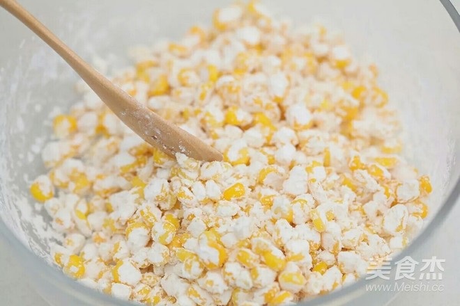 水淀粉倒入玉米粒上,煎至無水狀態(tài),再倒入沒過食材的食用油炸3-5分鐘,炸至玉米粒金黃酥脆就可以出鍋了