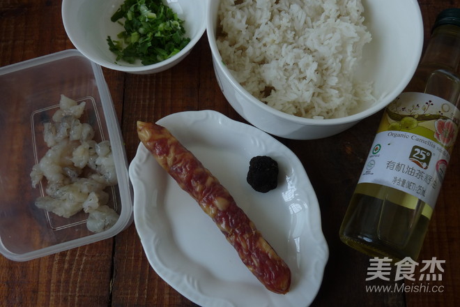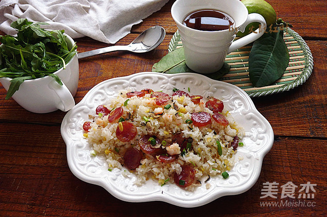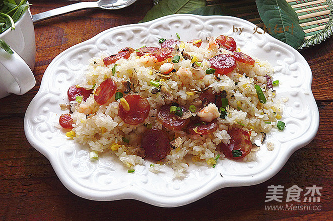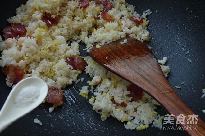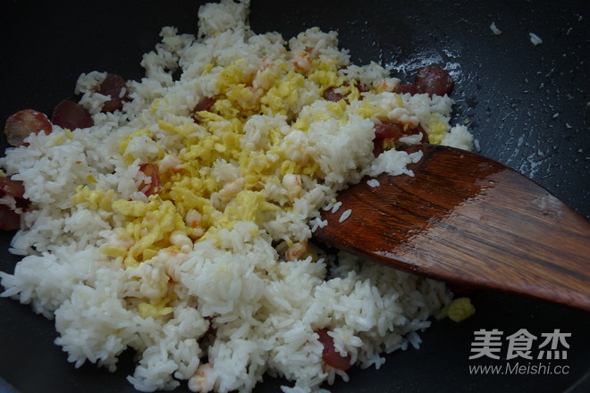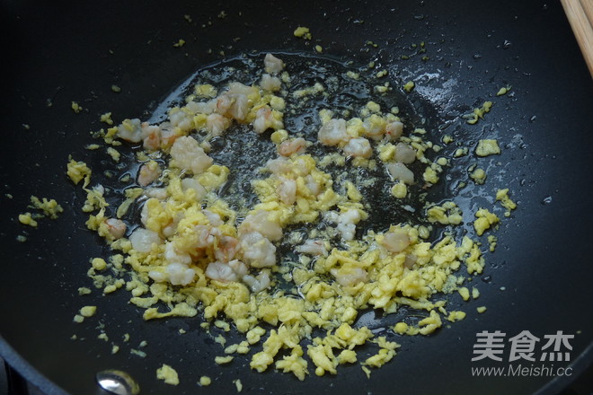 把飯炒一下后中入蛋松與蝦仁