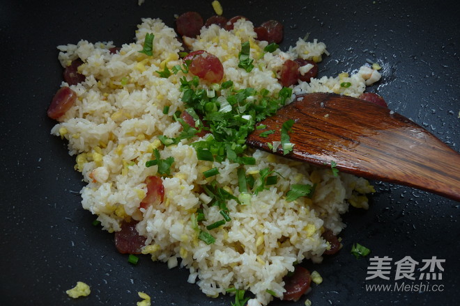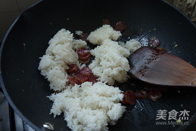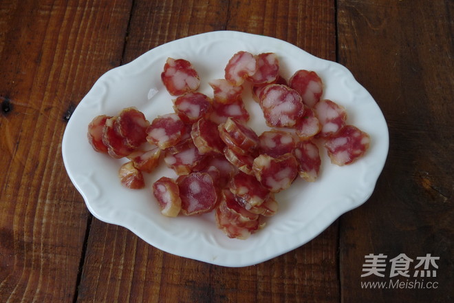 原鍋下小許油,放切片的臘腸,煎至有有點(diǎn)透明