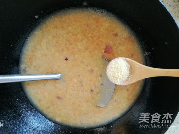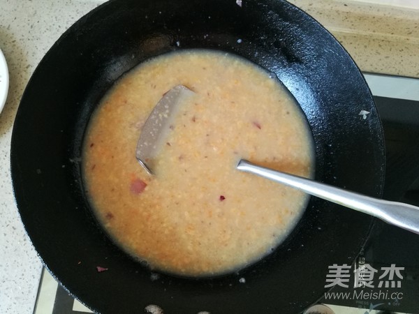 倒入鍋中,加適量清水或高湯,用鍋鏟壓勻