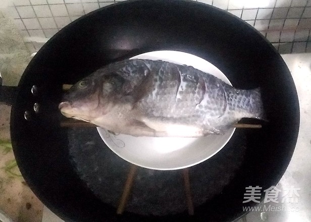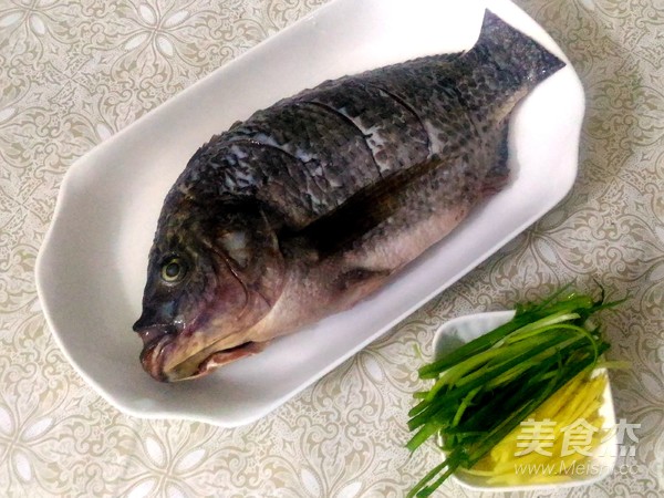 鯽魚洗凈,在兩面切幾刀加入適量鹽腌10分鐘,蔥和姜切絲