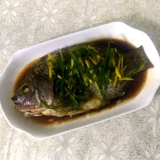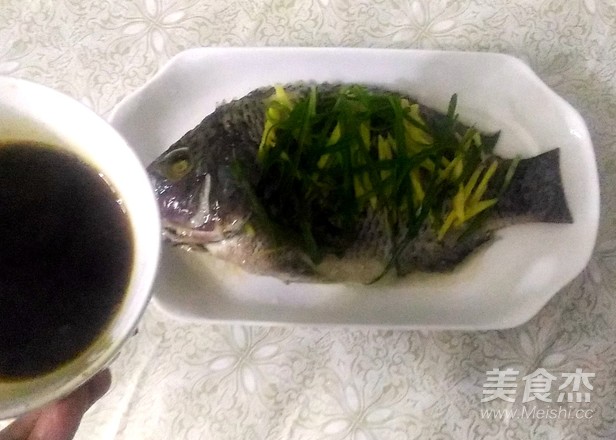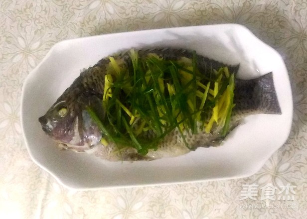將蒸好的魚擺入盤中,擺入切好的姜絲和蔥絲