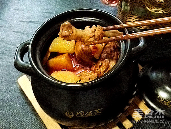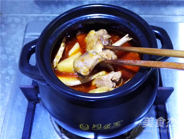 19.期間要翻動食材,防止粘鍋,當(dāng)湯汁已經(jīng)減少一半,鴨腿肉成熟、土豆軟爛即可關(guān)火。