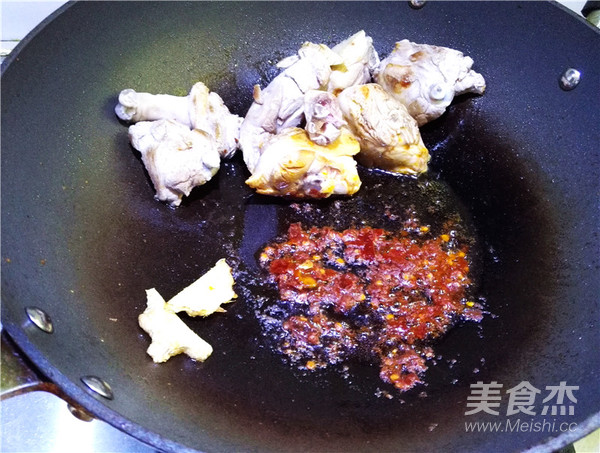10.將鴨肉撥至鍋邊,中間放入少許油,將郫縣豆瓣醬放入炒出紅油。