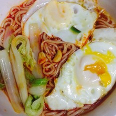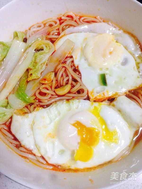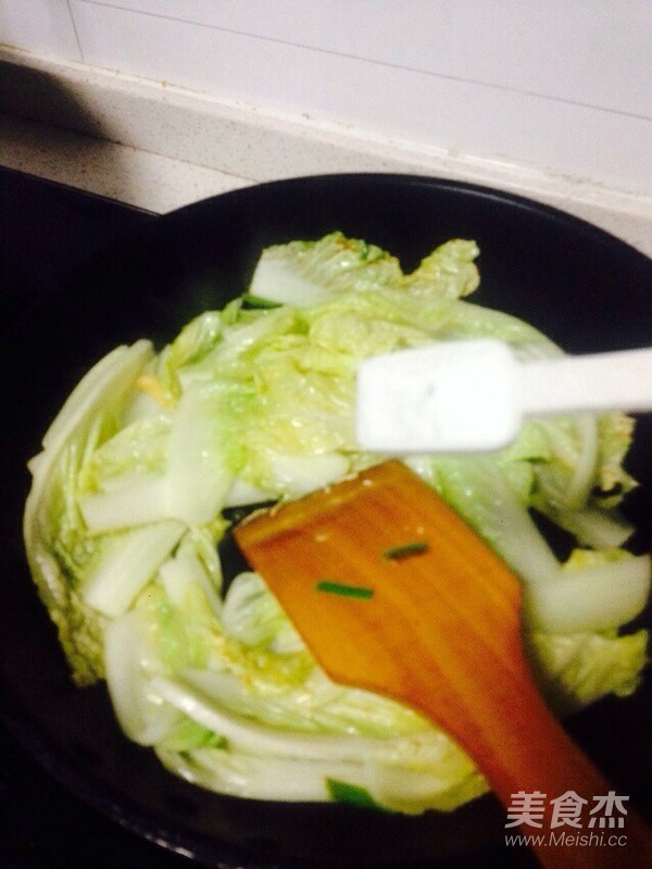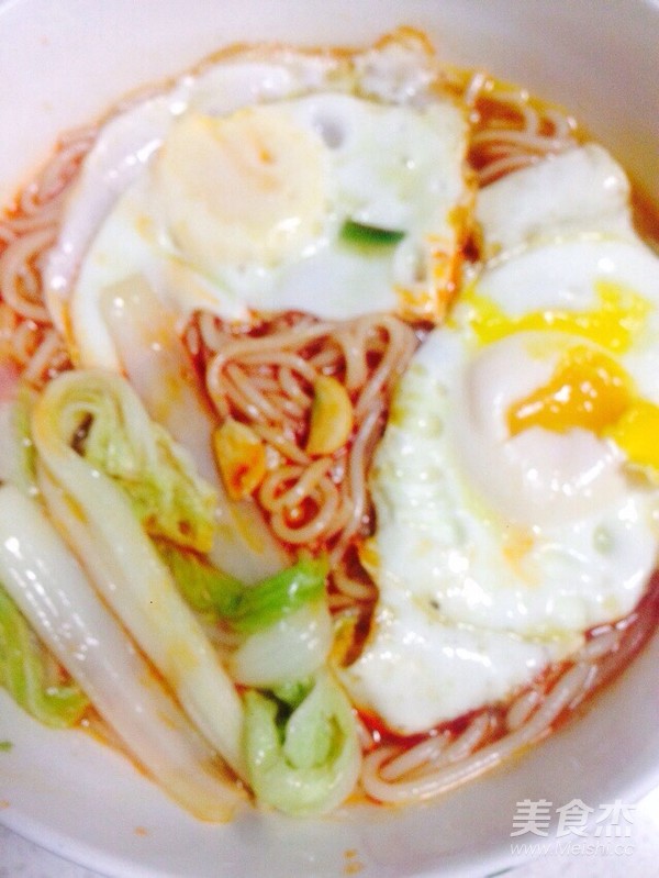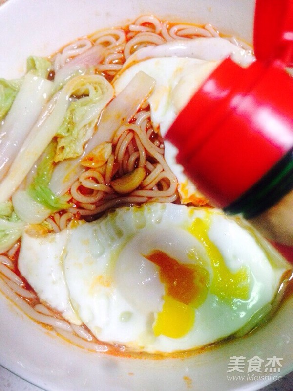 把雞蛋,白菜和辣椒醬放入米粉中,淋入陳醋