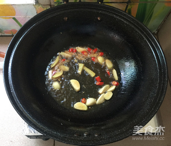 鍋中留底油,下生姜,大蒜,小米椒翻炒。