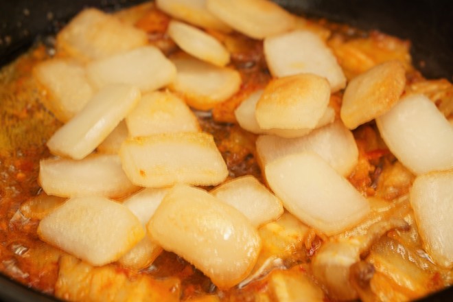7.加入炸好的年糕片翻炒均勻