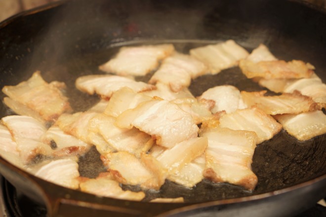 4.將肉片直接放入鍋中大火煸炒將肉片中的油煸出來即可,之后將多余的油脂倒掉。