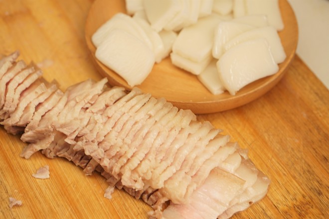 2.五花肉提前煮熟,在煮的時候可以適當(dāng)加入一兩片姜和少許酒,肉煮到用筷子可以扎動即可,切片待用