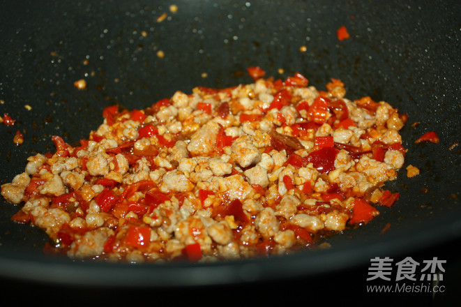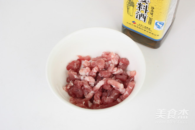 1.豬肉末中加半湯匙料酒,拌勻后腌制待用。