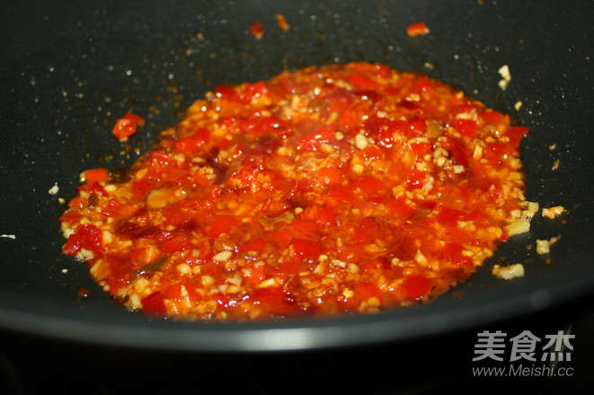 7.泡紅椒翻炒出香后加入1湯匙郫縣豆瓣醬,炒出紅油。