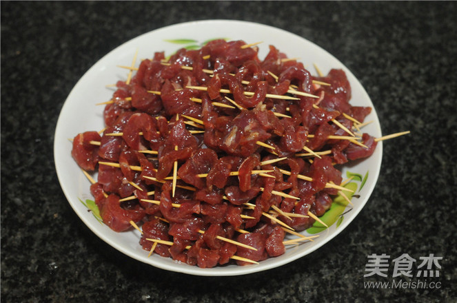 6.將腌制好的牛肉條用牙簽穿起來,這個過程有點費時間,最好能有個幫手