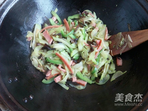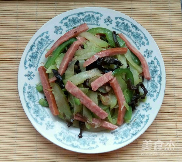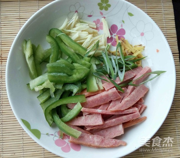 青椒和火腿切條,姜、蒜和蔥切絲。