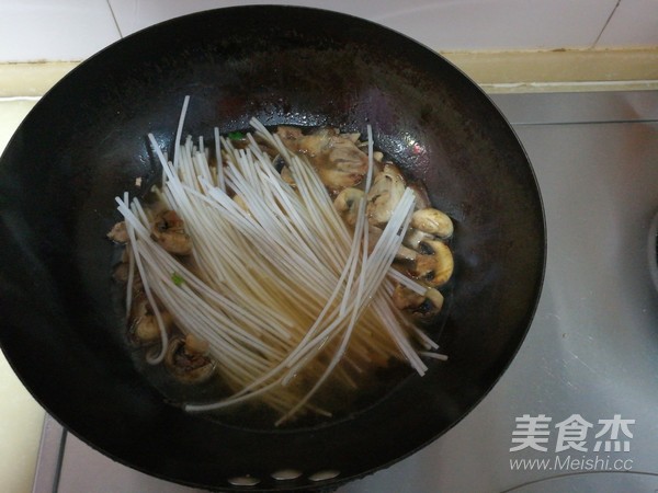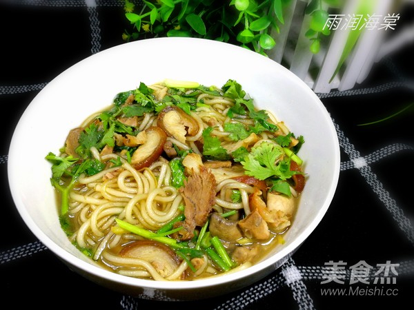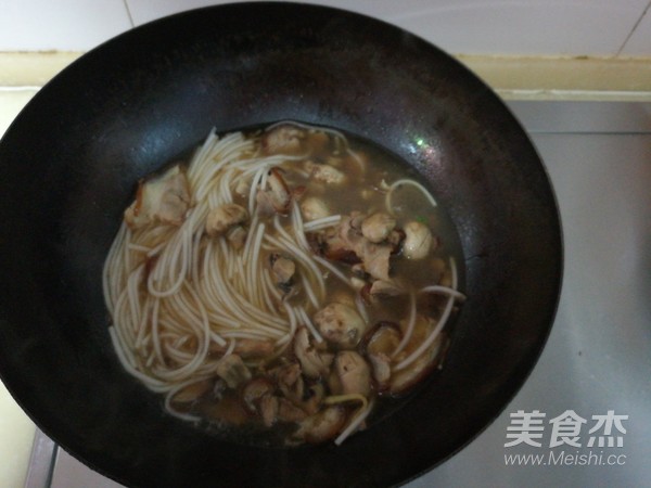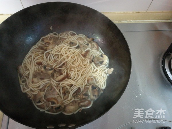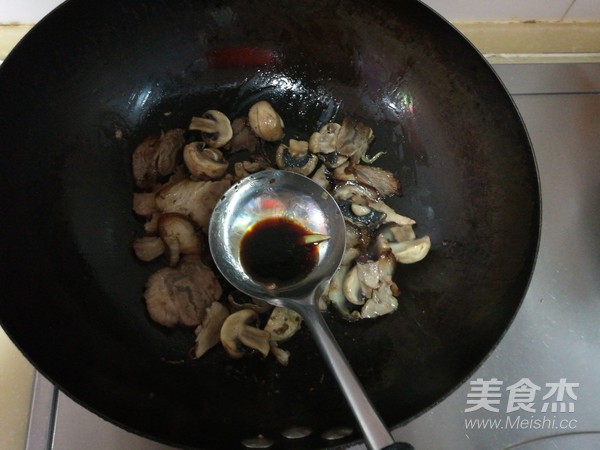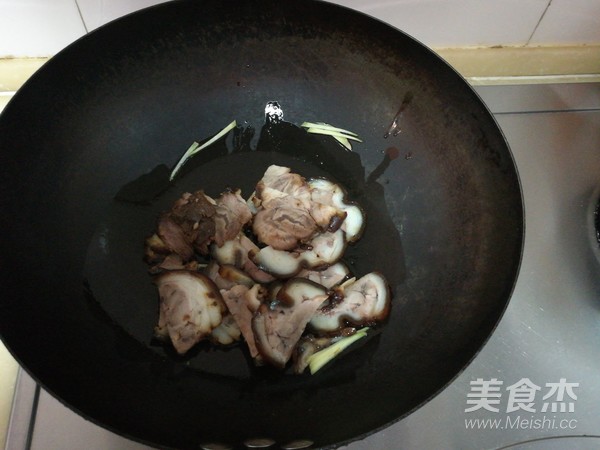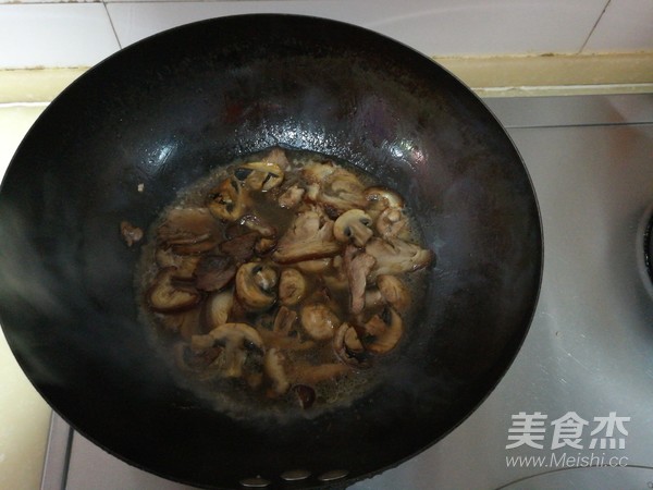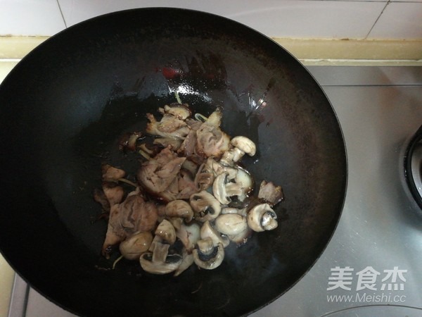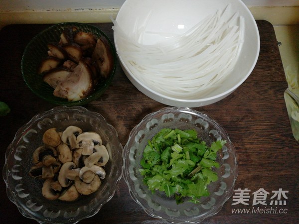 準(zhǔn)備食材:土豆粉用水泡軟,肘子肉是自己醬好的,口蘑用水焯一下切片