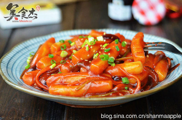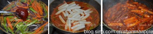 8.煮開以后放入年糕,讓年糕均勻地裹上辣椒醬