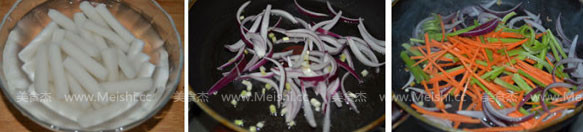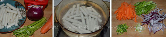 3.煮年糕的時(shí)候,可以一邊準(zhǔn)備配料,將胡蘿卜、洋蔥切絲、芹菜切段,蔥切花