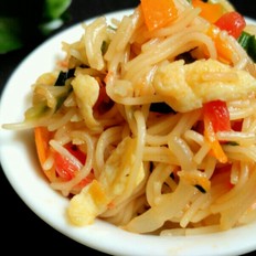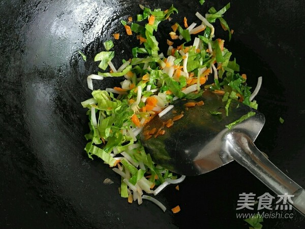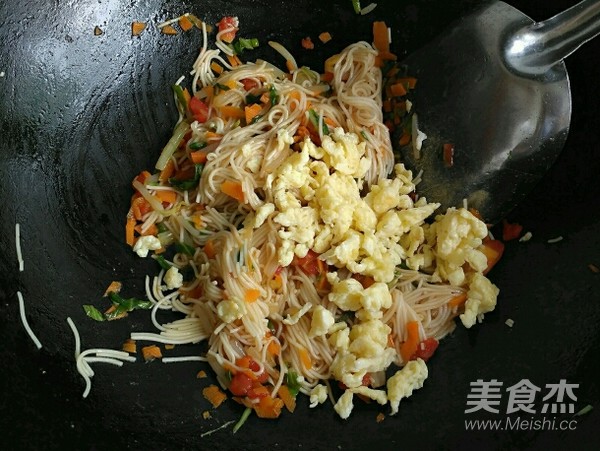 面條放進去炒幾下,倒入雞蛋翻炒幾下,放點鹽就可以出鍋了。