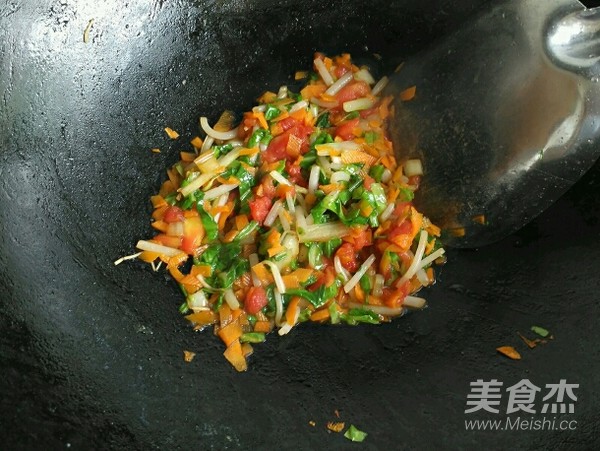 西紅柿放進去翻炒,放點醬油繼續炒,感覺干就少放點水,因為油放的少別糊了。