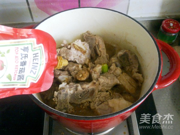 湯汁剩下一半時加入番茄醬,加入鹽。
