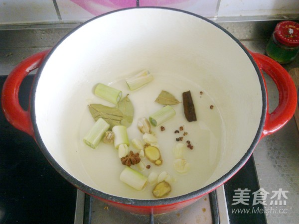 鍋里倒入油,放入蔥、姜、蒜、花椒、大料、香葉、桂皮,炒香。