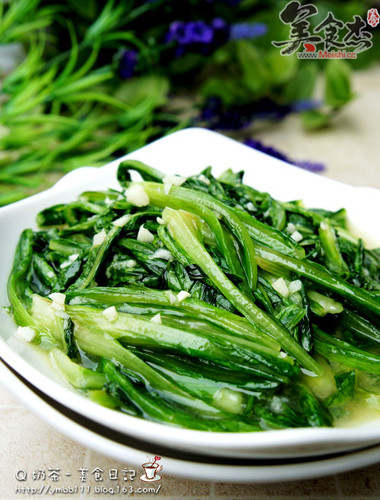 4.下油麥菜,快速翻炒幾下,炒到油麥菜碧綠將剩余的蒜蓉全部加入,調入鹽和味精即可