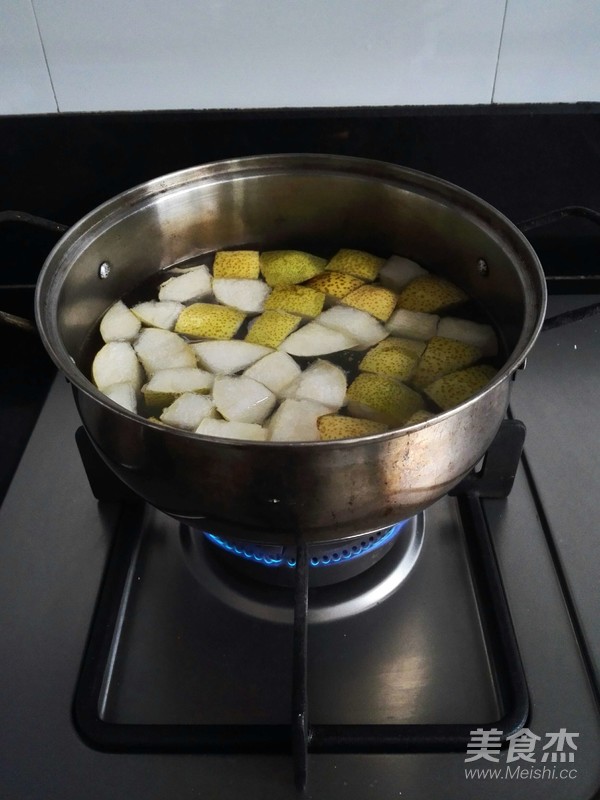 3.上火悶煮,水量控制在蓋過(guò)雪梨2/3處,這樣收掉汁水之后,留下的量大約為一碗的量。