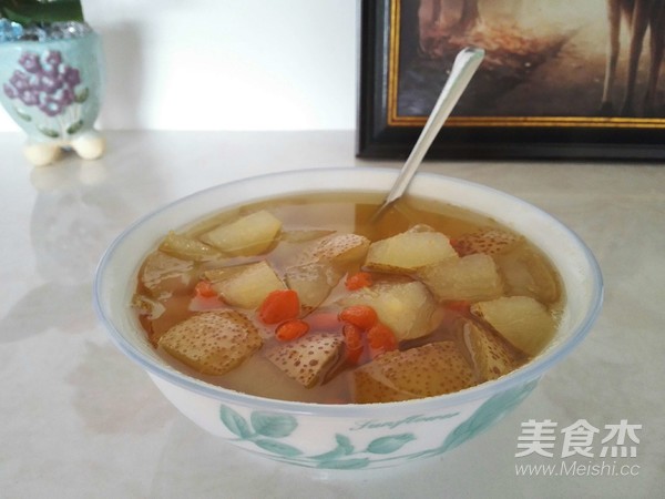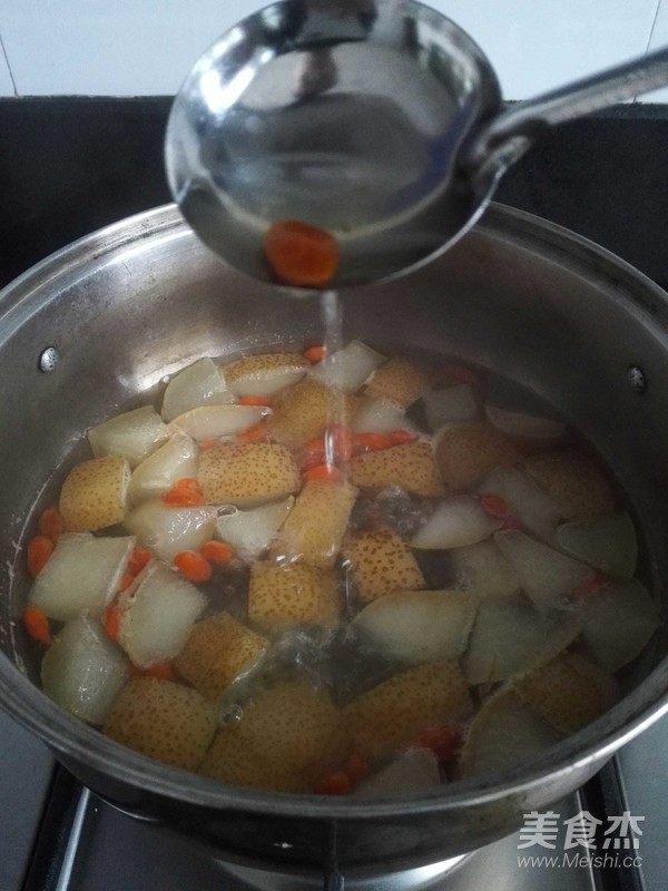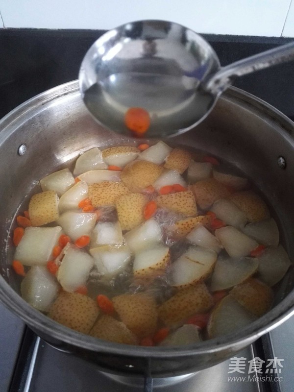 5.雪梨果肉呈通白的狀態(tài),大約過(guò)了十分鐘之后呢,可以加入枸杞。