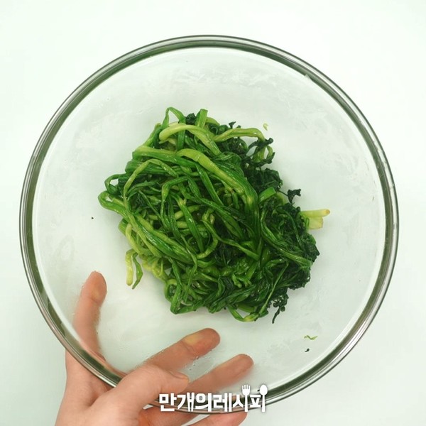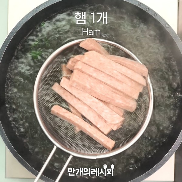 在水芹菜焯過的水里,把切成長條的火腿也一起焯一下