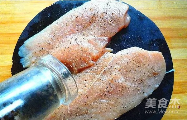 雞胸去筋膜,從中間片開一分為二,分成兩大厚片,撒鹽和黑胡椒碎