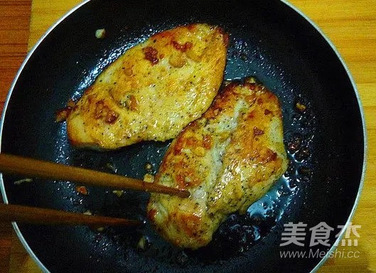 平底鍋入少油,雞胸入鍋小火煎至