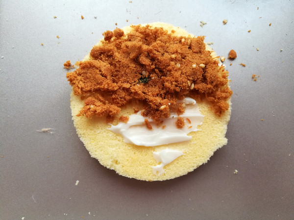 在蛋糕的底部涂上適量的沙拉醬,一邊放上海苔肉松