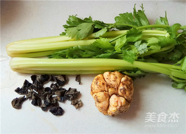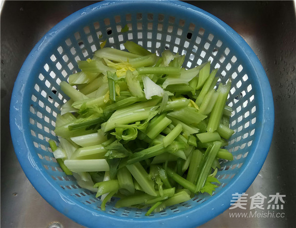 摘去西芹兩邊的筋洗凈,切成較薄的2厘米的斜段。