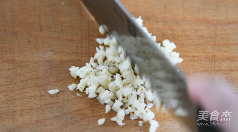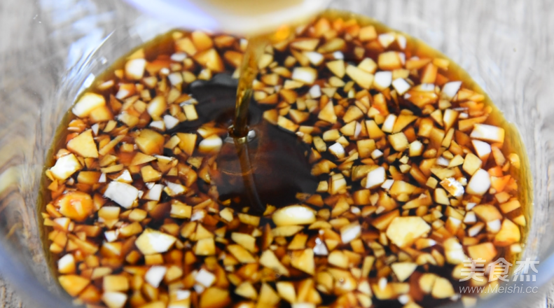 碗中倒入蒜 10g、鹽 2g、生抽 15g、醋 10g、香油 5g、糖 4g,拌勻