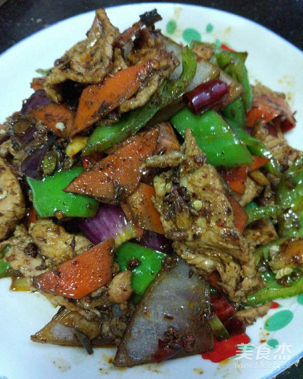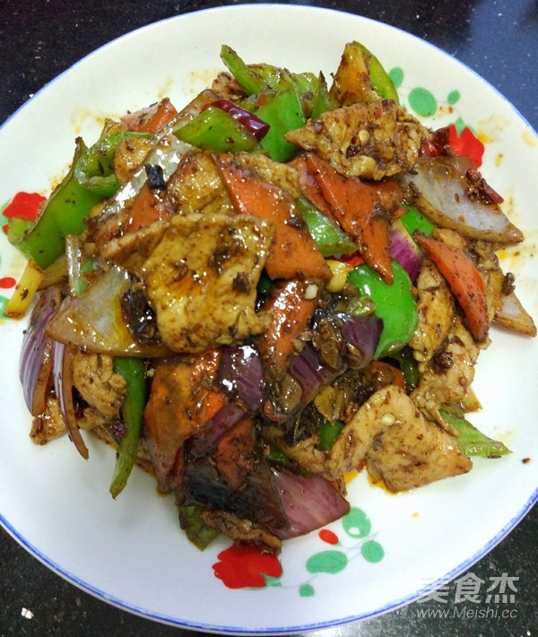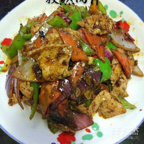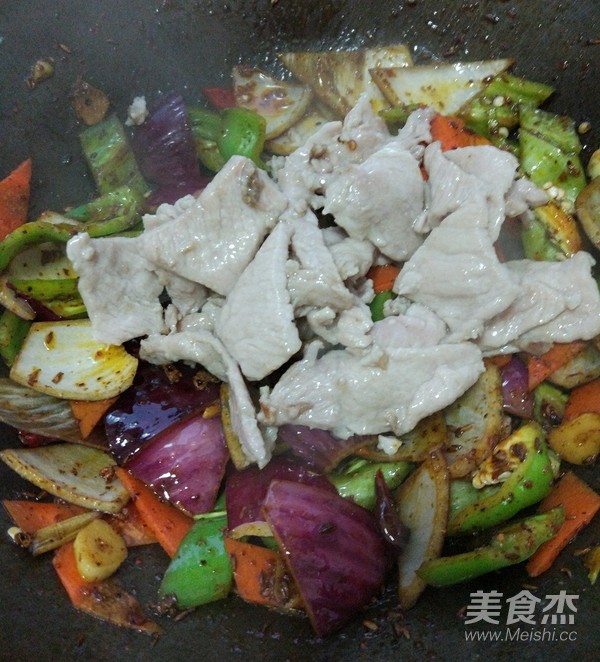 下入尖椒,胡蘿卜,洋蔥一起翻炒,邊炒邊調入糖,胡椒粉。