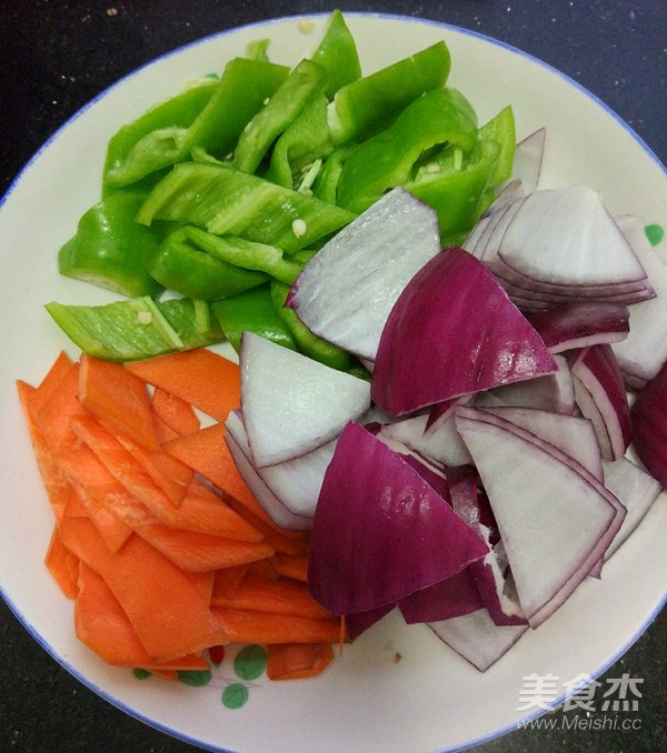 尖椒,胡蘿卜切菱形片,洋蔥切片。