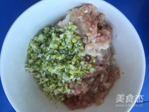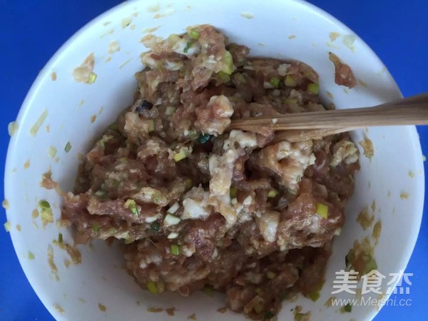 蔥和姜切末倒入肉餡中,再加入所有調料,沿著一個方向使勁攪打,讓肉餡上勁,這樣更好吃