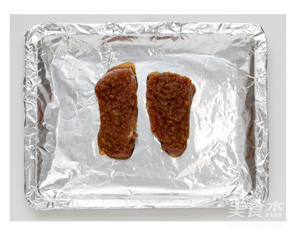 烤盤鋪滿錫紙,刷上調和油,將腌制好的里脊肉放在烤盤上