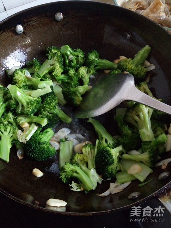 倒入汆燙好的西蘭花煸炒一下