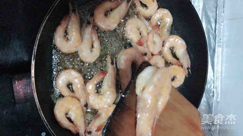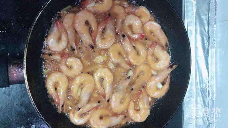 加入番茄醬一起炒,加料酒,醬汁少的話可以放一點點清水,加清水一定要燒開后再放大蝦