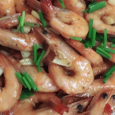 放入大蝦后,加鹽和糖,翻炒均勻,加小蔥,出鍋
