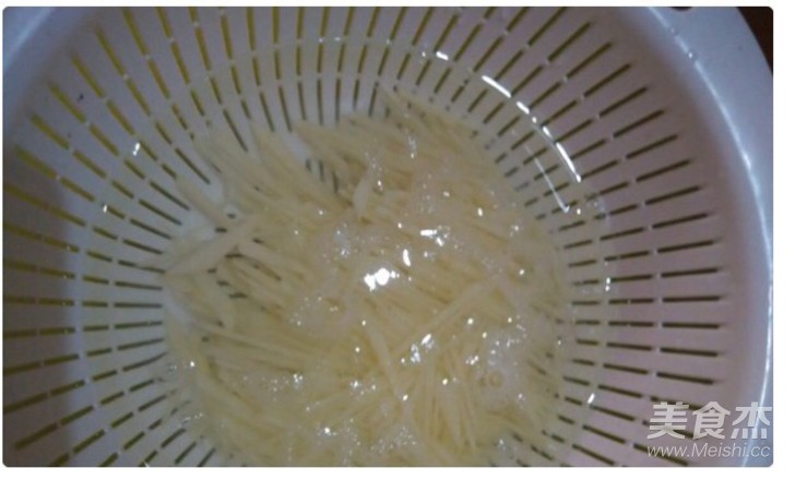 3.將切好的土豆絲放在一盆涼水里泡10分鐘左右,這樣炒出來更佳清脆