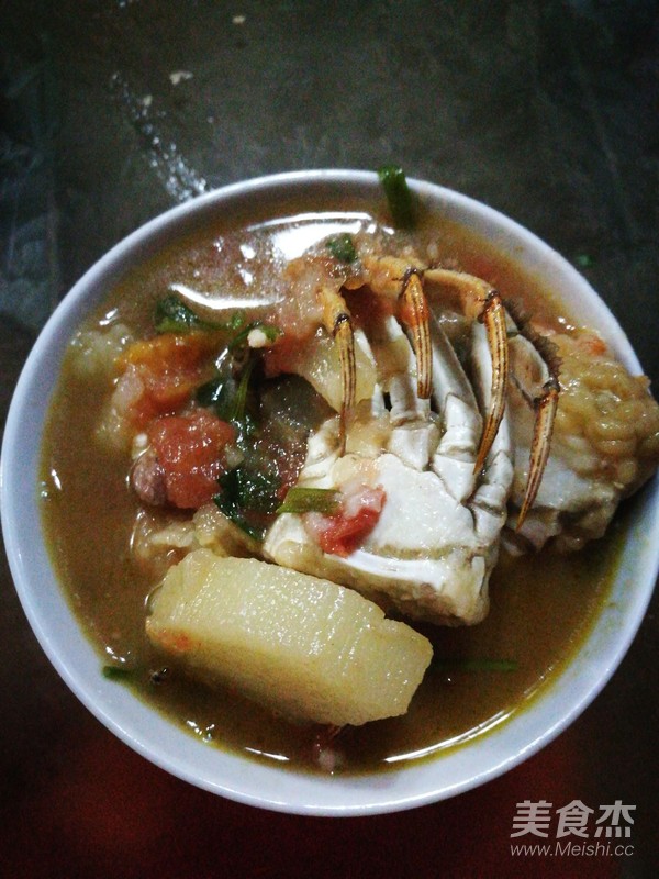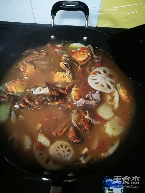 7.之前的西紅柿盛出后不用洗鍋,直接倒排骨,加水燒開,轉成小火,燜煮十分鐘后,倒入西紅柿,大火煮開小火燜燒五分鐘后倒入土豆蘑菇藕片,大火燒開繼續轉小火煮十分鐘然后倒入煎好的螃蟹再大火煮開小火燜煮十分鐘。