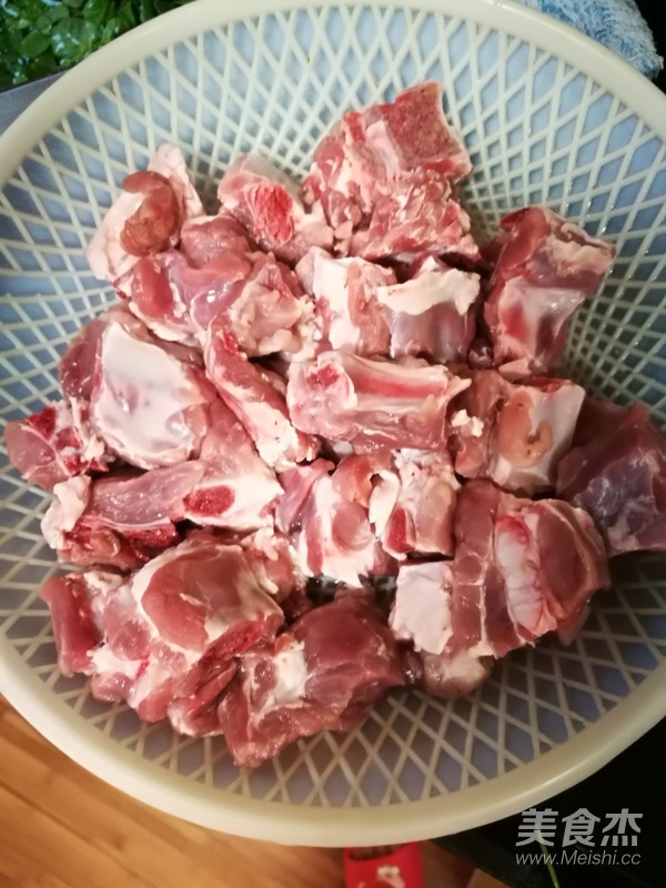 1.肋條泡水半小時,泡出血水,撈出放入盤中。所以菜都洗好。西紅柿洗凈切滾刀塊。鍋里倒入幾滴油翻炒。
