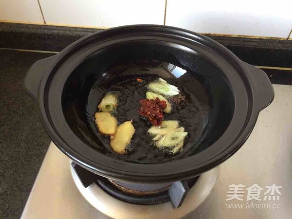 鍋內(nèi)放油,熱后爆香蔥姜,郫縣豆瓣醬炒出紅油