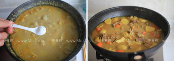 8.放鹽調味,繼續燉至土豆塊和胡蘿卜塊軟爛,湯汁收濃即可