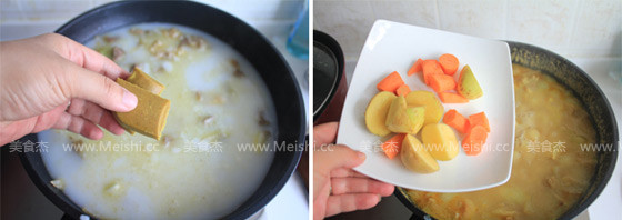 7.放入咖喱塊,中小火燉牛肉7成熟,放入土豆塊和胡蘿卜塊